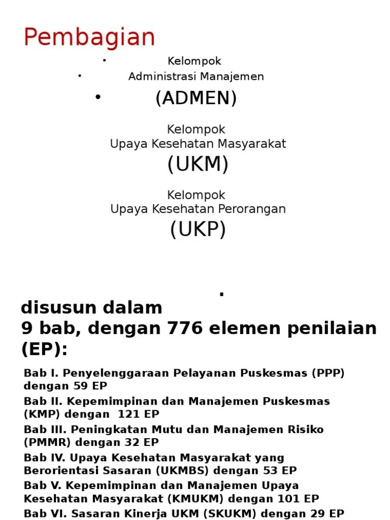 Puskesmas terdiri dari 9 bab, dengan total 776 elemen penilaian.